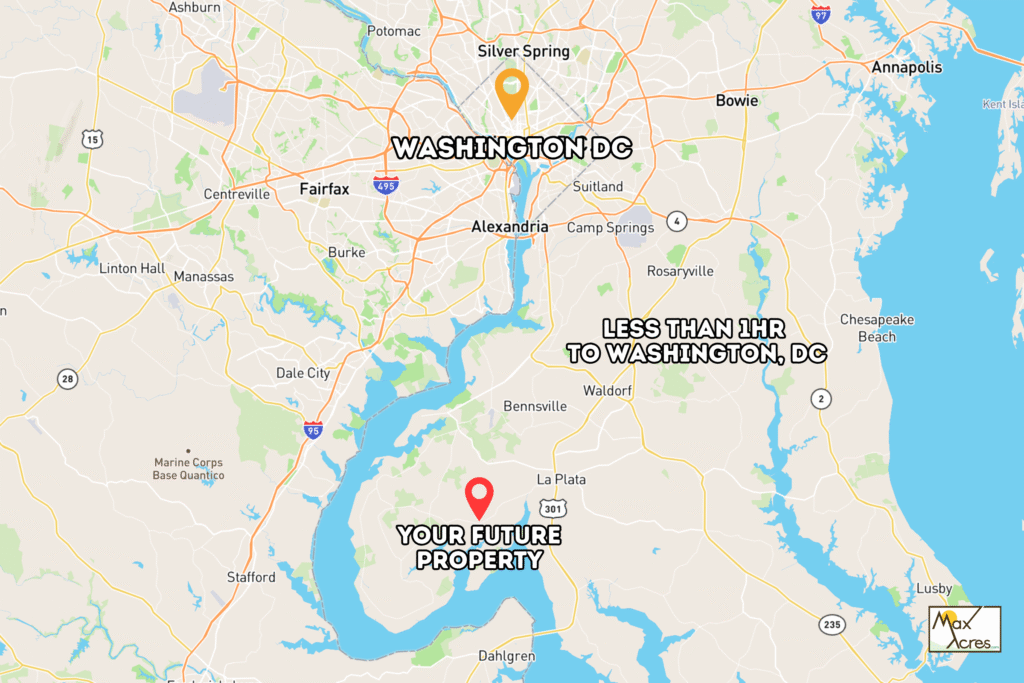 Just under an hour from Washington, D.C., this 3-acre property in Charles County, Maryland, offers the peace of country living with the convenience of city access. Surrounded by parks, trails, and state forests, it’s a rare opportunity to own land that blends rural privacy with outdoor recreation — and still stay close to everything.